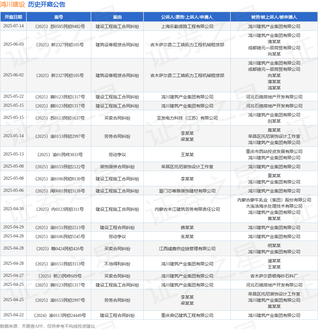 本站消息诚利和 ,根据天眼查APP显示诚利和 ,近日公布了一则鸿川建筑产业集团有限公司作为被告/被上诉人的开庭公告,详细内容如下: