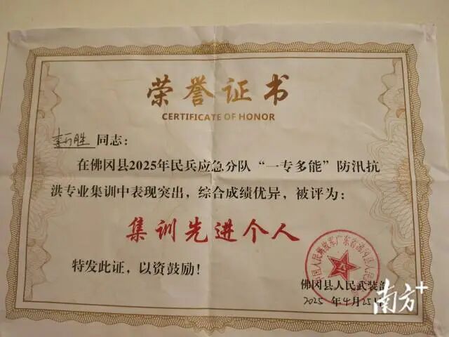 退役军人李万胜在佛冈县2025年民兵应急分队“一专多能”防汛抗洪专业集训中获得荣誉。龙山镇 供图